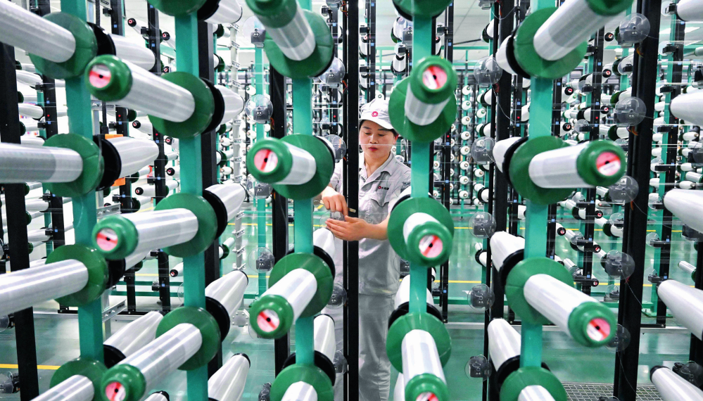 位于河南安阳林州市的河南光远新材料股份有限公司电子布准备车间,工作人员在检查整经机机台(2024年3月6日摄)李安摄/本刊