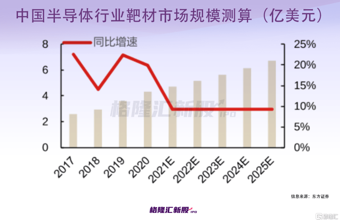 就拿先导薄膜的基本的产品——靶材来说,它是高速荷能粒子轰击的目标材料,具备“小而美”的属性,常见的有铝靶材、钛靶材、钽靶材、铜靶材、ITO(氧化铟锡)靶材等,主要使用在于平板显示、太阳能电池、半导体等领域。公开多个方面数据显示,2020年全球靶材市场规模约188亿美元,我国靶材市场规模达到46亿美元。而随着各领域的技术变革、产能转移和扩张,对相关靶材的需求量也在不断增大。